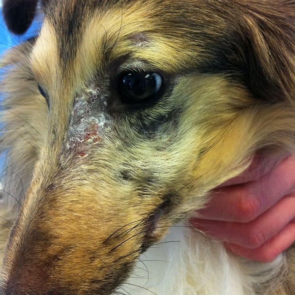 Les troubles cutanés débutent généralement autour des yeux, des lèvres, sur le chanfrein, à l’extrémité des oreilles, de la queue et des membres. Dans les formes sévères, une atteinte des saillies osseuses (coude, genou, carpe, tarse, …) est possible. Ils se manifestent par un érythème qui évolue rapidement vers des papules, des ulcères puis des croûtes qui laissent la place à une cicatrice sans poils, plus ou moins dépigmentée.