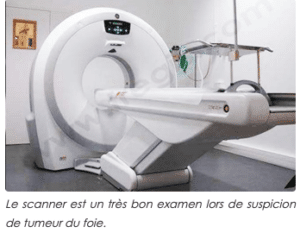 L’examen scanner avec produit de contraste (angioscanner) s’avère très intéressant. Il permet de localiser très précisement la masse, d’identifier la présence éventuelle d’autres nodules dans le foie mais également de rechercher des métastases dans l’abdomen ou le thorax (on parle d’un bilan d’extension). Lors de masses volumineuses ou multiples, le scanner est un examen indispensable à la planification chirurgicale.