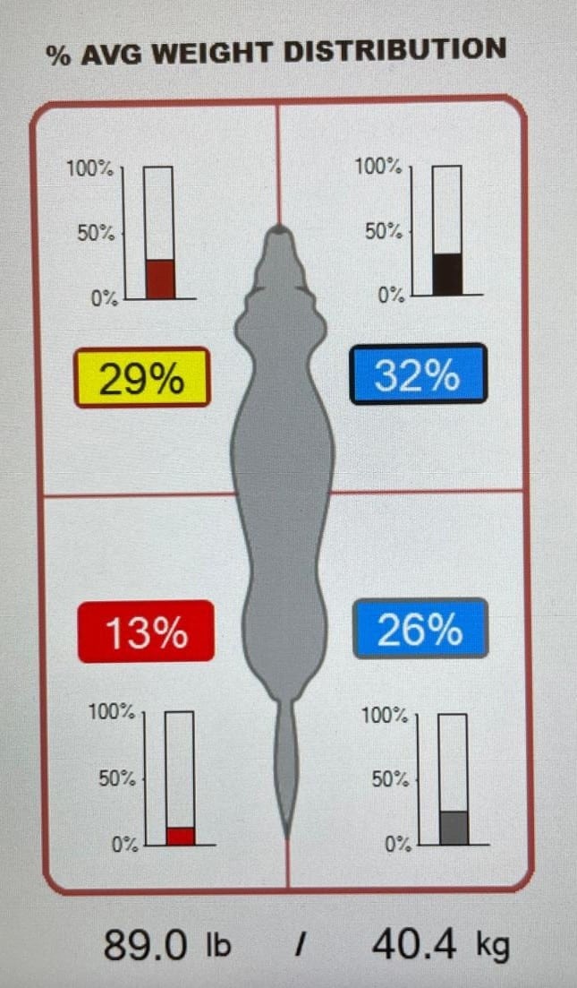 • Les pourcentages de répartition du poids (idéalement : 30 % sur chaque membre antérieur, 20 % sur chaque postérieur chez le chien),