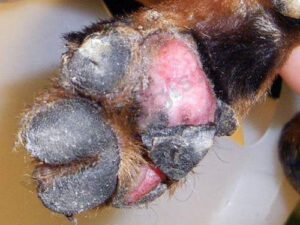 Lésion du coussinet sur la patte avant d’un chien Pinscher nain atteint d’un Syndrome d’automutilation podale.